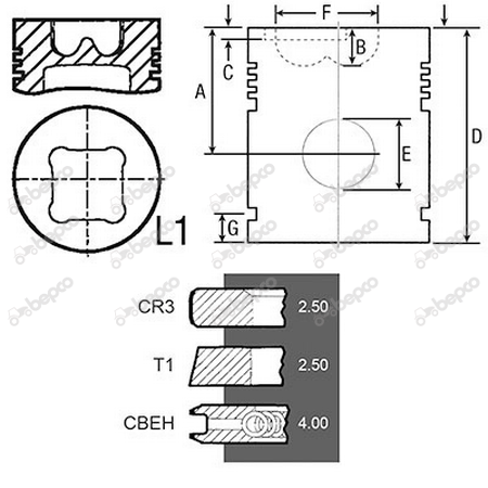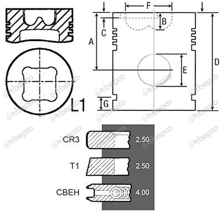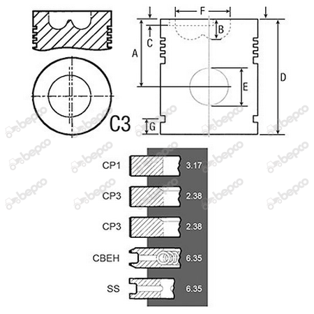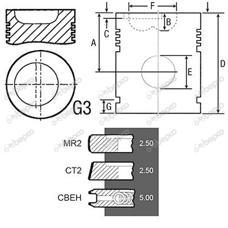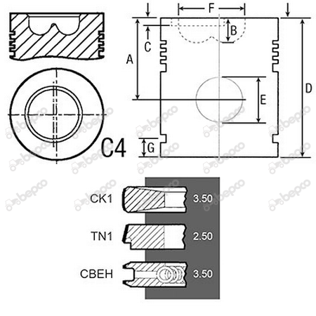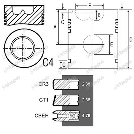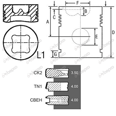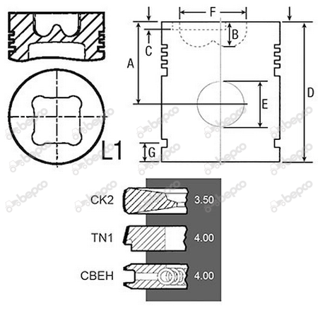 Bore 100 Piston rings 3 Al-fin ✔ A 70.00 B+ / B- 19.62 D 108.20 E 38.06.MM