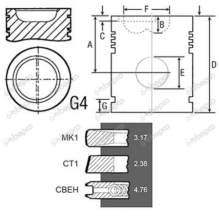 Bore 100 Piston rings 3 Al-fin ✔ A 70.02 B+ / B- 19.48 D 108.06 E 38.00.ММ